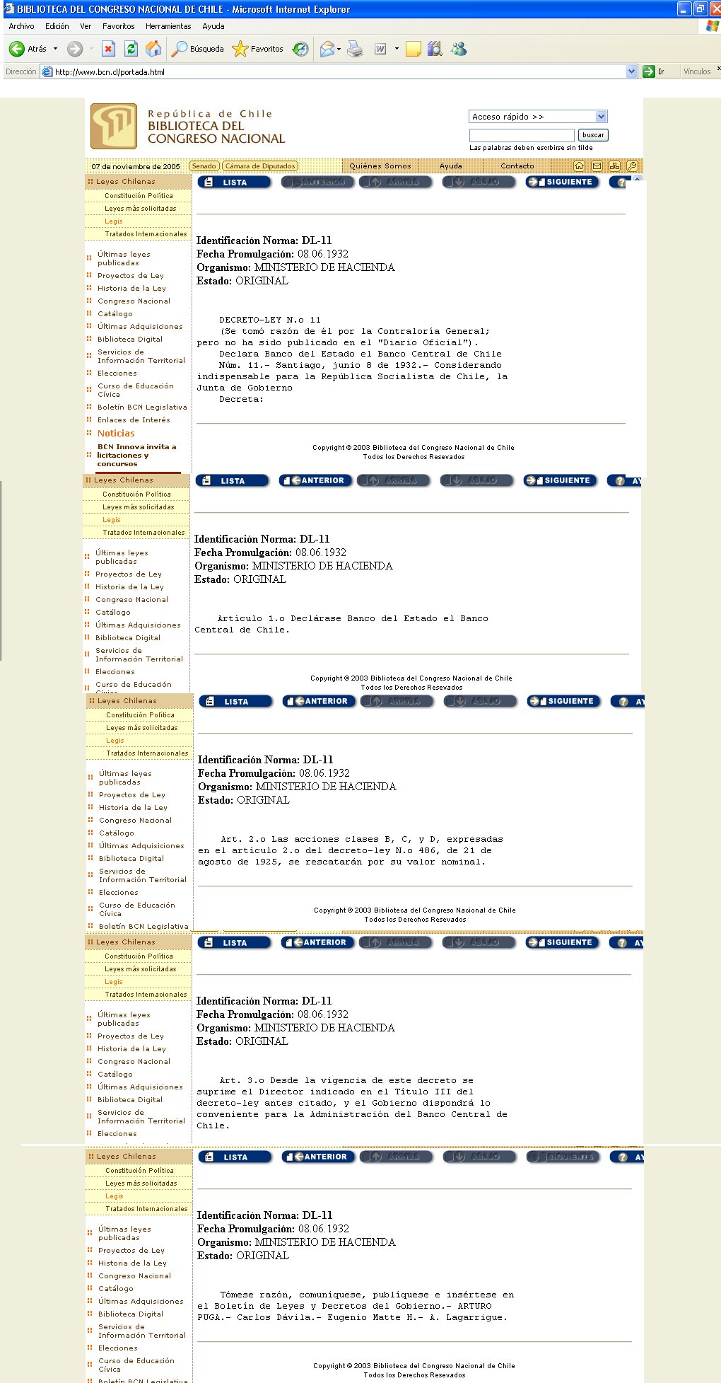 Peso: 1079 kb) del Ministerio de Hacienda de 8 de junio de 1932, se declara Banco del Estado al Banco Central de Chile. Contraloría General de la República. Recopilación de leyes por orden alfabético y numérico. Tomo XVI.